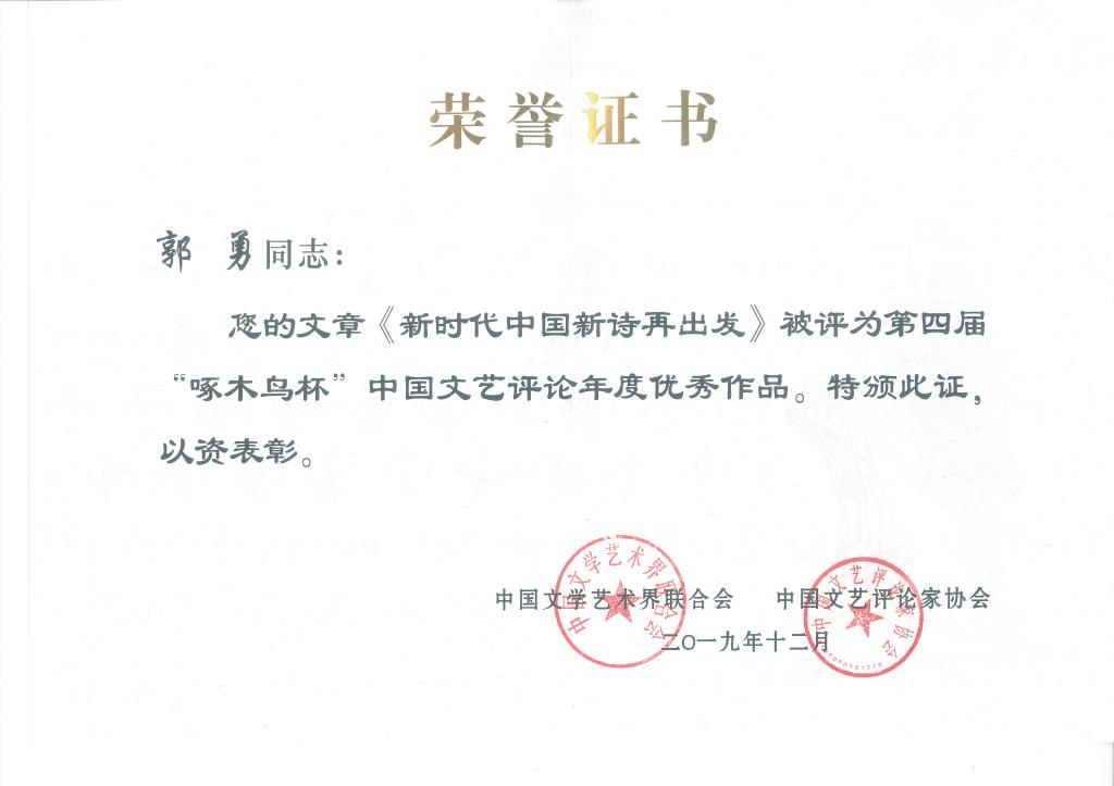 近日获悉,公司中文系郭勇教授的论文《新时代中国新诗再出发》获得第四届“啄木鸟杯”中国文艺评论年度优秀作品奖。“啄木鸟杯”是由中国文联与中国文艺评论家协会联合主办的中国文艺评论界的最高奖项。为深入贯彻落实党的十九大精神和习近平总书记关于文艺工作的重要论述,认真落实《中共中央关于繁荣发展社会主义文艺的意见》中关于高度重视和切实加强文艺评论工作的明确要求,中国文联、中国文艺评论家协会自2016年起在全国...