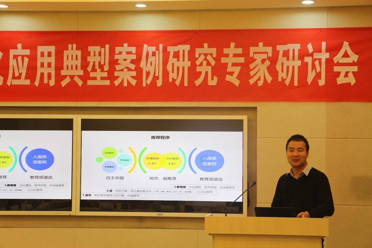 接着,中央电教馆蒋宇对基础教育信息化应用典型案例的基本情况进行了介绍。项目起源于2016年的示范培育推广计划,确定了教育信息化的工作要点与目标任务,即在基础教育领域形成30个区域60所公司的典型案例。此外,项目对区域与公司在案例的选择方向上提出了具体的要求,并规定了案例遴选的程序与评价指标。最后,蒋宇对首批典型案例的基本情况、材料构成与材料特色进行了详细介绍。