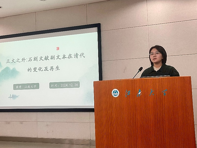 接着,中文系黄璟带来了题为《正文之外:石刻文献副文本在清代的变化及再生》的报告。黄博士通过具体的实例分析了明末清初以来金石学者如何反思并实践石刻文献的著录工作。她特别关注了石刻名称、题名纪年及题跋这三类副文本的变化,展示了它们如何反映时代特征和个人意志,以及清代学者在石刻阅读和研究方面的贡献。此外,她还讨论了这些副文本在清代辑本中的变化特点,揭示了清代石刻文献编纂的独特之处。