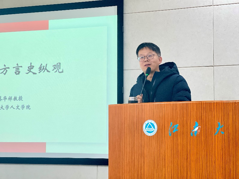 首先,中文系蔡华祥以《江苏吴方言史纵观》为题,从历史的角度出发,详细回顾了吴语的发展历程。蔡教授指出,吴语不仅是汉语分化最早的地域方言之一,也是吴文化的主要载体和重要组成部分。讲座中,蔡教授不仅追溯了吴语从先秦时期的起源到现代的发展脉络,还探讨了吴语在词汇、语音和语法方面的独特特点及其与中华优秀传统文化之间的紧密联系。蔡教授强调,保护和发展吴语对于传承中华文化具有重要意义。
