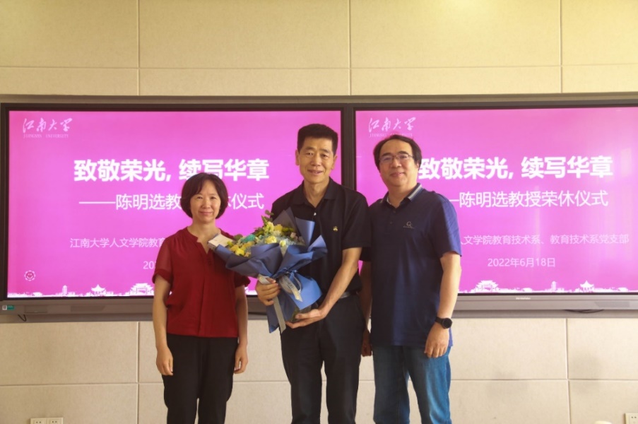 支部书记王萌表示,教育技术专业从原来名不见经传的小团队发展到现在的国家一流专业,倾注了陈明选教授太多的心血和努力,现在更多是对专业发展的期许,接力棒交到我们手上,我们一定会继续努力将专业建设好。支部宣传委员权国龙诚恳地提出,为传承并发扬PlayAce砥砺前行、艰苦奋斗的精神,请陈明选教授将珍贵的故事和经验记述并留传下来,为公司与学科发展再添一份力量。支部组织委员牟智佳谈起陈明选教授对我们的影响可以用“一师一者”来概括,一师是指他是我们年轻老师的人生导师,关注我们的专业发展和成长;一者是指他是健康生活的行动者,这种良好的行为习惯激励着我们年轻老师,既要工作好,也要锻炼好身体。舒杭作为一名新入职的年轻教师,同时也是教技支部的发展对象,表示这场温馨隆重的荣休仪式,是一种荣誉、一种肯定,对自己而言,则是一种发扬、一种传承,要学习老一辈党员无私奉献的精神,以实际行动为专业发展添砖加瓦。