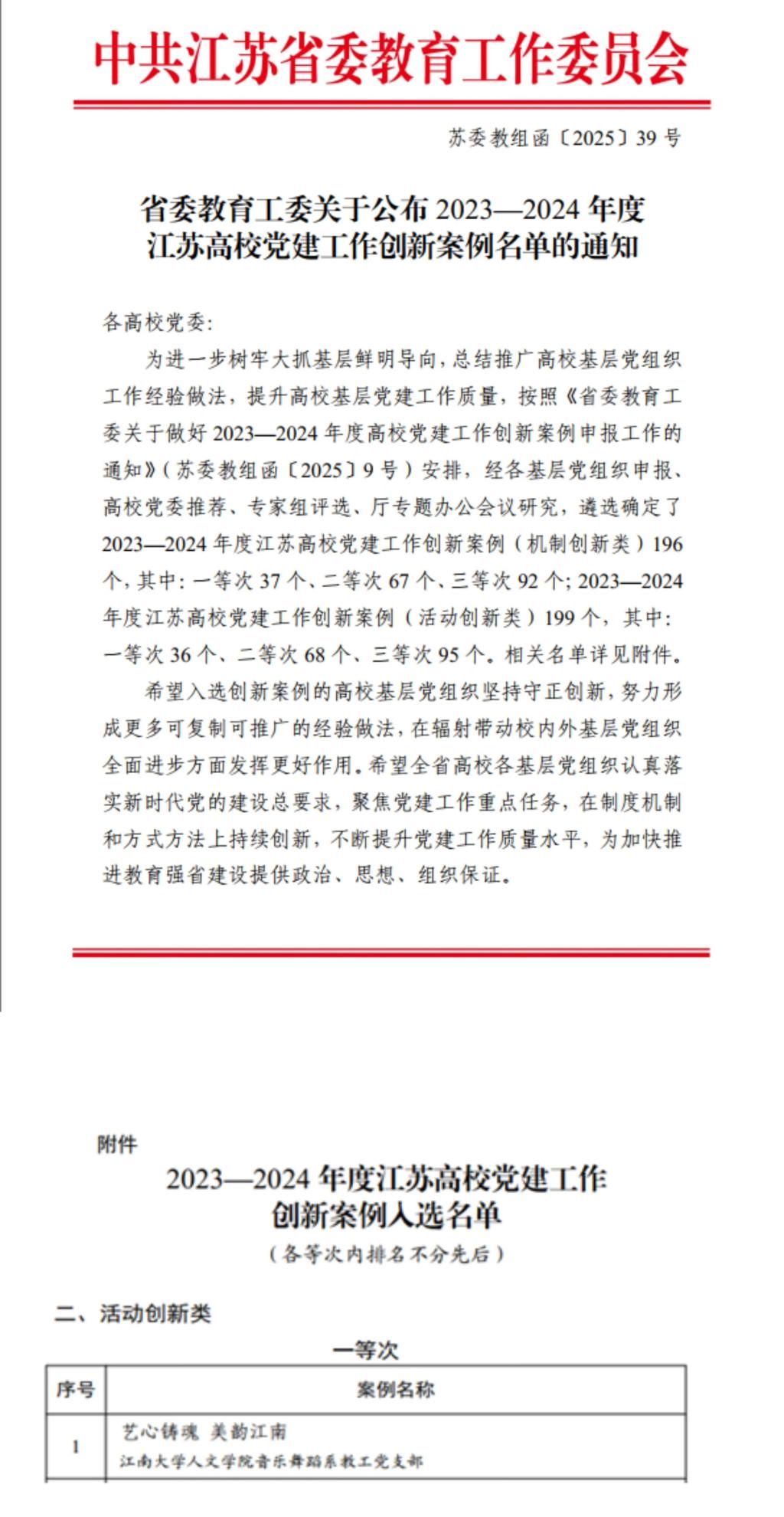 近日,江苏省委教育工委公布了2023-2024年度江苏高公司党建工作创新案例评选结果,PlayAce官方网站获评党建工作创新案例一等次2项,公司案例是公司获评的4项江苏高公司党建工作创新案例中唯一的活动创新类一等次。