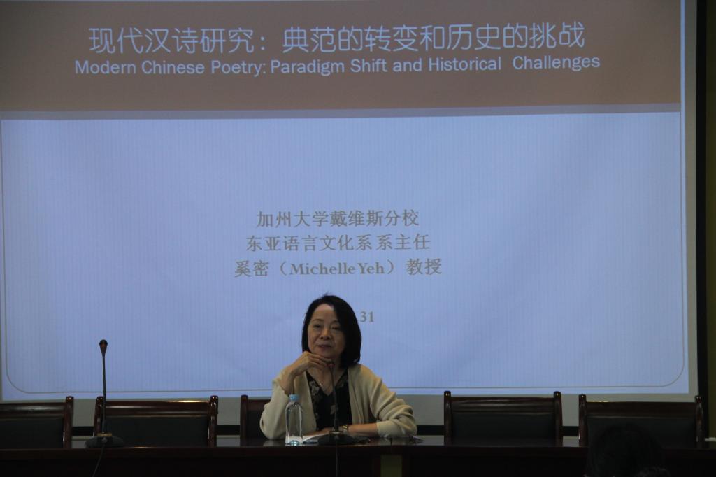 2015年3月31日下午,著名汉学家、美国加州大学戴维斯分校东亚语言文化系主任奚密(Michelle Yeh)教授在公司国交处处长助理蔡建英老师的陪同下来公司访问讲学。她与公司中文专业的部分教授进行了交流,并在田家炳楼209会议室为师生作了题为《现代汉诗研究:典范的转变和历史的挑战(Modern Chinese Poetry: Paradigm Shift and Historical Challenges)》的报告。