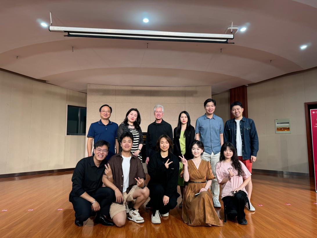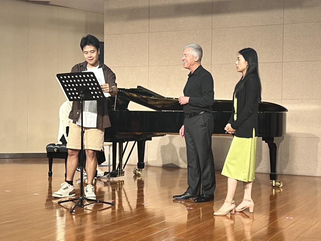 在教学互动环节,Robert Wells教授为音乐系四位员工进行了个性化歌曲指导。首位员工演唱了歌剧《唐璜》中的咏叹调《夫人请看这张名单》。Dr.Robert Wells强调,在演唱意大利歌曲时,元音的连贯性至关重要,建议员工在演唱前充分吸气,保持声带的持续打开状态,并确保声音位置的稳定性。紧接着第二位员工演绎了歌剧《艺术家的生涯》中的咏叹调《漫步街上》。Dr.Robert Wells指导员工在演唱时避免用力挤压声带,而是应放松身体,让气息自然吸满并保持流动。他推荐通过高抬腿边走边唱的方式来帮助身体放松,同时在走动中利用背部肌肉为歌唱提供支持。第三位员工呈现了歌剧《塞尔维亚理发师》罗西娜的咏叹调《美妙的歌声随风飘荡》。Dr.Robert Wells建议通过转动胯部等身体活动来训练演唱时的核心稳定性,同时保持声带的放松和元音的连贯,确保气息带动声音持续向前,以维持音乐的流畅性。最后一位员工演绎了歌剧《费朵拉》洛里斯的咏叹调《被阻止的爱》。Dr.Robert Wells首先对员工的声音和歌唱能力给予了肯定,并建议在演绎时避免过度用力,推荐使用气泡音和打嘟噜等技巧来辅助演唱,以轻松减少喉部的压力并放松声带。在讲座问答环节,参会员工就声带保养、气息训练及快板的演唱技巧等具体问题与Robert Wells教授进行了热烈交流,师生们纷纷表示受益匪浅。