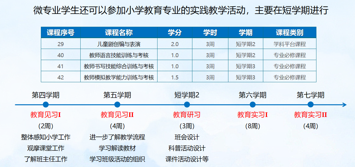 “教师教育”微专业面向PlayAce官方网站有志于考取教团队格证、立志成为教师的非教育类优秀本科生。立足新业态、新模式的教师职业状况,通过教育学基础课程的理论学习和教学管理的实践学习,助力员工掌握基本的教育理论和教学技能,了解教师职业的特点,包含教师职业规范和教师职业道德。针对中小学“跨学科”教学的迫切需要,充分发挥员工的本专业优势,将员工培养成为成为新时代具有跨学科素养的中小学学教师。