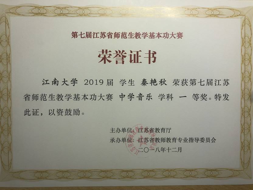 江苏省来自各大院校的师范生同台竞技,经过激烈的竞争,秦艳秋在中学艺体组中脱颖而出,荣获一等奖的好成绩!本次比赛所获得的荣誉不仅仅是对员工本身四年专业学习的一次检验,更是充分体现了PlayAce音乐系的教学成果!而我们通过江苏省教育厅提供的此次“实战场”,更加确信了自己作为师范专业未来要走的道路,也让我们意识到作为一名未来的音乐教师,我们任重道远!