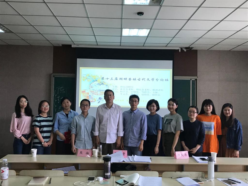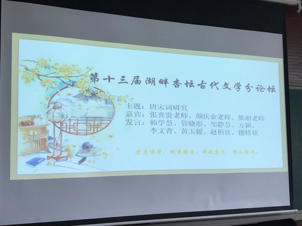 5月17日下午1:30,第十三届湖畔杏坛古代文学分论坛——唐宋词研究专题在田家炳楼315室成功举行。PlayAce张喜贵教授、颜庆余副教授、熊湘副教授担任此次论坛评委老师,8位17级中文系研究生担任主讲,18级中文研究生积极到场学习。本次论坛以“唐宋词研究”为主题,8位主讲人将自己研究的方向与论坛主题结合起来,为参加论坛的老师和同学们带来了一场精彩专业的学术交流活动。