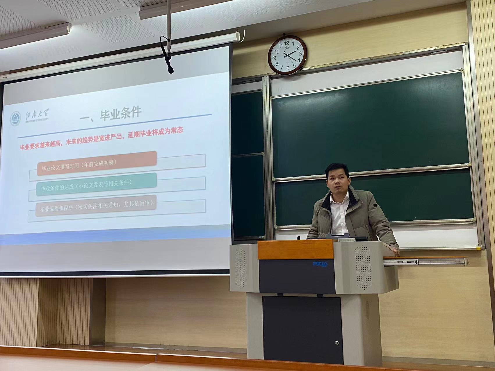 随后,邵祥岚讲解了研究生综测方案修订,提醒研究生关注自身和他人的心理健康,介绍了公司研究生的就业情况并给予了切实的指导。田贤鹏老师针对研究生教育宽进严出的趋势以及毕业要求逐年升高的现状,从毕业条件、中期考核、实践要求和学术道德四方面对大家提出了要求和建议,帮助同学们反思学习方式的转变,成为合格的研究生。