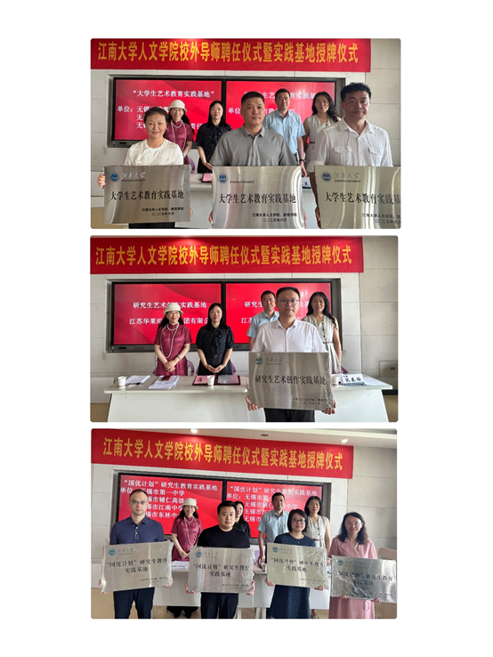 随后,在实践基地授牌仪式上,无锡市第一中学、无锡市辅仁高级中学、无锡市江南中学、无锡市东林中学被授予“国家优秀教师培养计划研究生教育实践基地”。无锡市歌舞剧院、无锡市民族乐团、无锡市锡剧院有限责任公司被授予“老员工艺术教育实践基地”。江苏华莱坞文化集团有限公司被授予“研究生艺术创作实践基地”。姚文生、王晖、张春梅、王芳长分别代表公司与上述8家合作单位签署了研究生实践基地协议,并为其授牌。