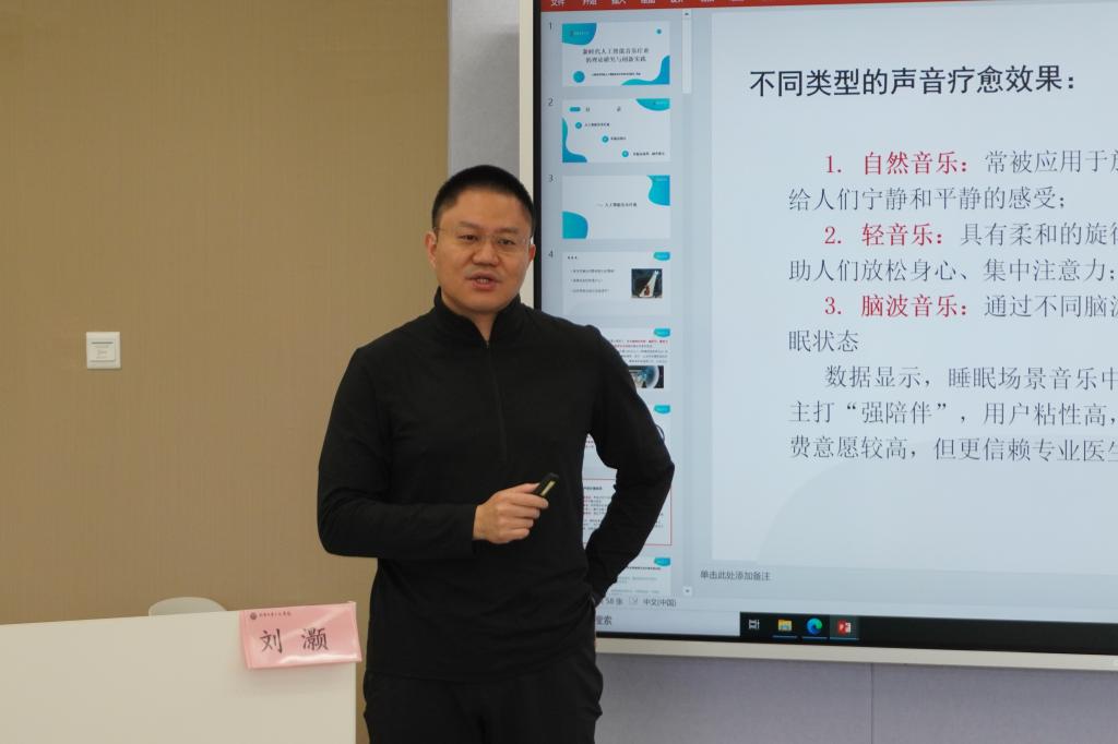 讲座伊始,刘灏重点讲解了人工智能音乐疗愈的六大应用场景,具体包括:改善睡眠、监测中小员工情绪、辅助早产儿发育、缓解孤独症与癫痫症状、帮助老年人应对记忆力下降,以及助力临终关怀。在随后的分享中,他重点分享了几项关键技术突破:一是可让听众沉浸式感受声音的空间技术;二是植物电信号装置能将植物信号转化为古筝、琵琶等传统乐器音色;三是骨传导睡眠枕头、音乐药盒等产品已实现量产,普通人可便捷使用。此外,刘灏还特别提到团队自主研发的AI音乐生成模型,该模型能够根据使用者的脑电波数据,智能推荐个性化疗愈音乐。