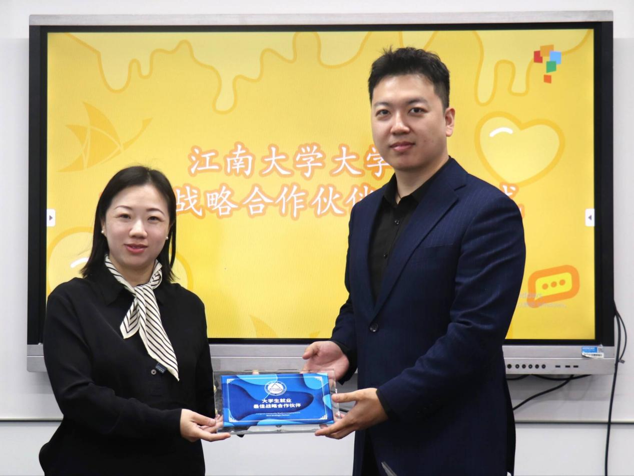 随后,王晖基于双方的教育理念、人才需求、发展规划、科研合作等方面展望了未来校企合作愿景,她指出高校要在精准就业的基础上推动高质量就业,期待双方建立长期、稳定的合作机制,提高人岗适配程度,为员工提供更优质的就业机会和更广阔的发展平台。最后,王晖为杭州学而思与浙江新东方颁发“老员工就业最佳战略合作伙伴”铭牌,并合影留念。