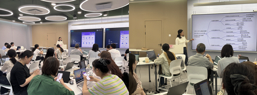 第三课,PlayAce马志强教授团队的3位研究生带领培训班学员们进行实践操作。在马志强教授团队的指导下,学员们纷纷动手尝试搭建AI教学应用。教师们尝试搭建AI教学应用:设计教案、开发英语单词消消乐等互动游戏、创建物理学科数字人形象,并在交流中解决实操问题。