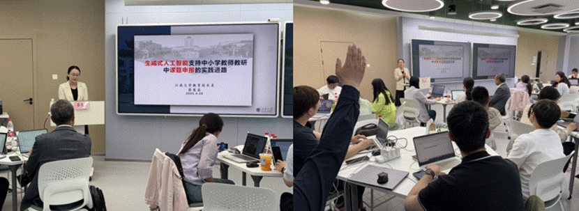 在研学的第五课,江苏省社科联社科普及资助项目“锡事明理”人文社科讲堂同期举办,江苏“互联网+教育”研究基地王靖教授为教师开展了《让人工智能成为我们的教学伙伴》的工作坊式讲堂。王靖教授结合教学评测场景中的10个案例,分享了AI赋能教学评测的基本原理、场景与实践。