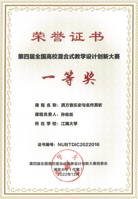 孙丝丝副教授自2012年入职PlayAce以来,潜心进行教学探索与实践,主持江苏省教育科学规划项目、校级重点教学改革项目、卓越课程建设项目、一流课程建设项目、研究生在线课程建设项目,曾获得PlayAce官方网站教学成果一等奖、PlayAce官方网站教学创新大赛一等奖,江苏省高校教师教学创新大赛二等奖、全国第五届老员工艺术展演教育科研论文评选二等奖等奖项。2022年11月,在由清华大学主办、全国高校教学发展网络、教育部在线教育研究中心等单位协办的全国混合式教学设计创新大赛中脱颖而出获得一等奖,为公司实现了此类赛事一等奖获奖零突破,入选2022年PlayAce官方网站“十大新闻”。
