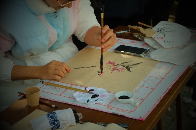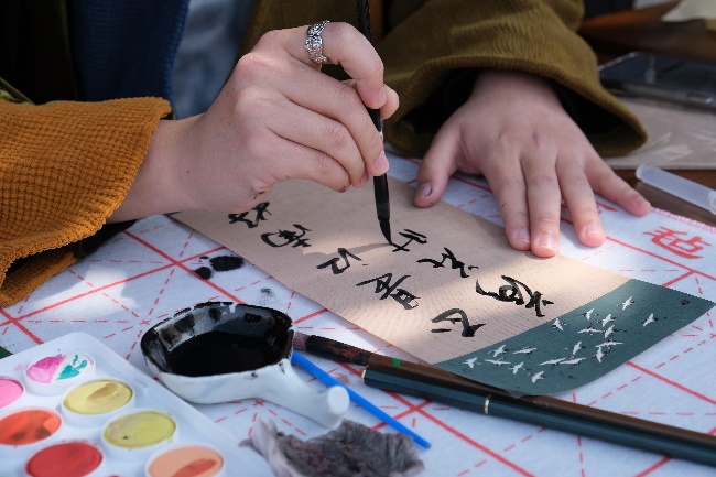 “瓦舍小集”部分包含五个互动环节。“雁字回时”书写信笺环节,参与师生将古诗词或心愿写在书签上,挂在樱花林,纸短情长,留下自己对春天的美好期盼。“茅塞顿开”环节包含猜灯谜、对诗词以及看图猜诗,蹙眉沉思之间体验古人吟诗猜谜的乐趣。“白羽飞矢”投壶环节再现“射者中,奕者胜”的喜悦与欢畅。“拨云见日”猜识甲骨文环节,古朴空灵、亦简亦繁的象形文字激发着人们以想象力与古人共情文字的魅力。“晕染江南”画团扇环节,参与师生绘山描水,织木画鸟,参与者亲自动手为自己定制一面团扇,与樱花相映,美美与共。参与以上活动,按照规则集齐相应印章者即获赠限定樱花明信片一套或樱花金属书签一组。同时,活动现场设置茶艺展示及古筝演奏,茗香沁人,筝声入耳,为现场师生及员工带来全方位的传统文化体验,精彩丰富的活动引来游人如织,络绎不绝。