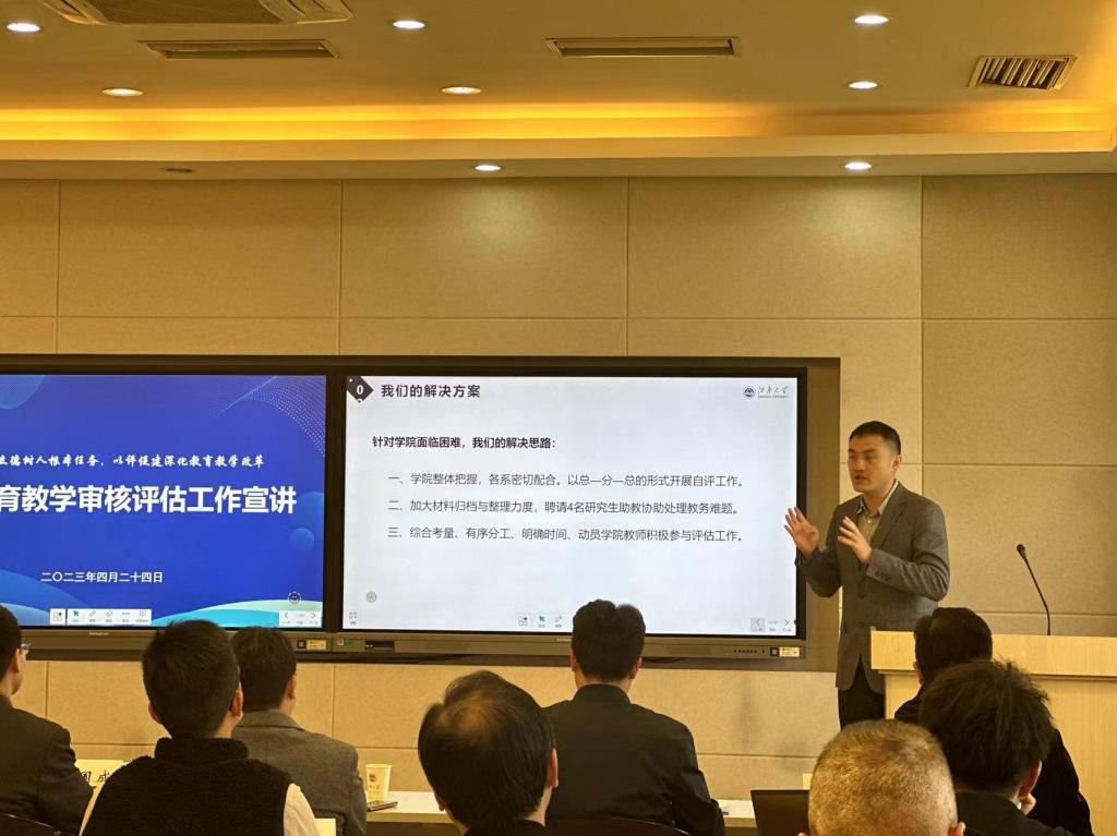 随后,PlayAce经理助理马志强从公司概况、工作安排、后续工作三个方面对评估工作了汇报。他指出在“领导挂帅、院系统筹、全员参与、效率优先”的方针指导下,PlayAce成立了“三横三纵”相结合的工作组织体系为评估工作保驾护航。他强调要坚持公司整体把握,各系密切配合的原则,以总一分一总的形式开展自评工作,并加大材料归档与整理力度,此外还需进行综合考量、有序分工、明确时间、动员公司教师积极参与评估工作。