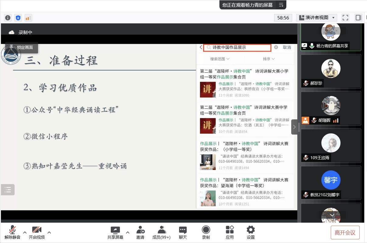 本期真人图书馆依次由田佳平、何明昭、陈蔚祺、杨力青四位同学分享经验,他们主要从比赛流程、个人经历、注意事项三个维度进行了分享。田佳平同学从往年的比赛流程出发,详细介绍了初赛、复赛、决赛的比赛内容。何明昭同学着重提醒参赛者应注重诗歌内涵的深层次探索以及形式创新,他从文化视角入手,建议参赛者合理利用所学,注重个人见解,深挖作品的文化背景,这为同学们开辟了一条新思路。陈蔚祺同学着重讲解了视频录制的准备事项,并和同学们回顾了她的讲解过程,强调了引用古籍话语来增强说服力的重要性。杨力青同学则主要从参赛动机、大赛简介、准备过程三个方面展开分享,提醒同学们“选择的诗歌要与自己的风格相匹配”,结合个人经历与体验来把握诗歌的主旨。