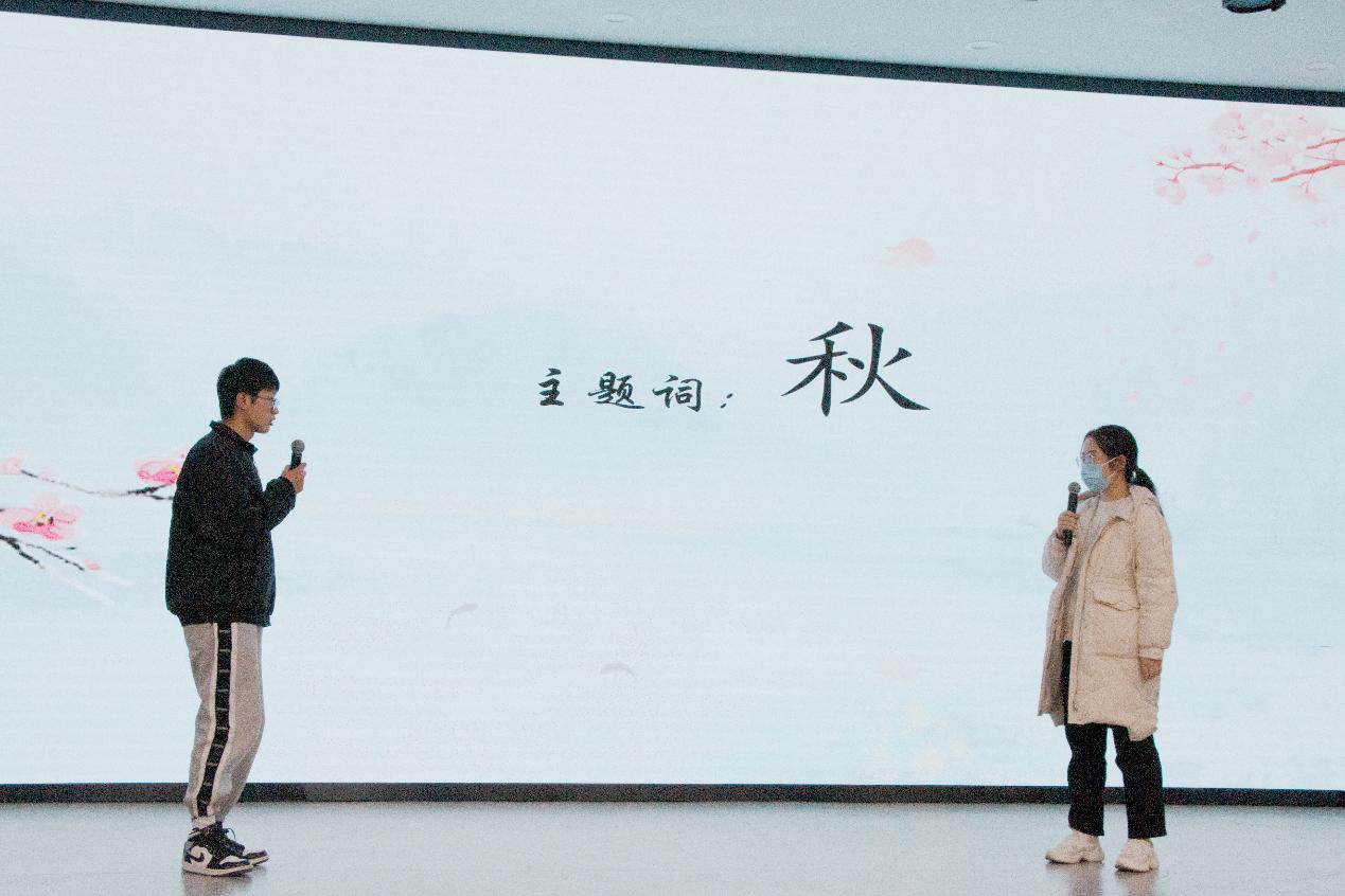 中场休息,国学社戏曲部带来戏曲串烧节目,展现了青年员工对传统戏曲的良好传承。个人赛环节包含“诗词飞花令”和“一站到底”两个环节,其中飞花令环节取用“月”和“秋”两个主题词,选手们反应敏捷,快速精准地背诵出相应的诗词,引得观赛师生鼓掌喝彩。“一站到底”环节,台上的选手根据题目信息背诵、推理和思辨,迅速作答,台下观众也踊跃参与。