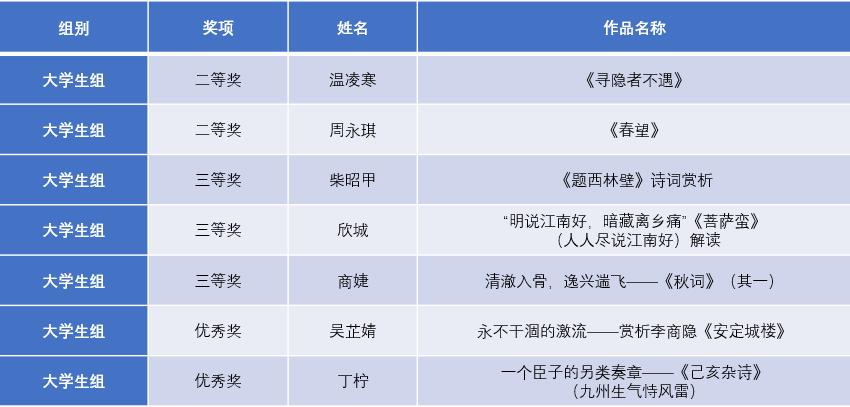 近日,由教育部、国家语委举办的第四届中华经典诵写讲大赛“诗教中国”诗词讲解大赛评选结果揭晓。通过初赛线上诗词素养测试、复赛微课录制、远程连线主旨演讲等环节的激烈角逐和综合比拼,PlayAce提交的作品从全国各高校参赛作品中脱颖而出,共有7件作品获奖,其中二等奖2件、三等奖3件、优秀奖2件。