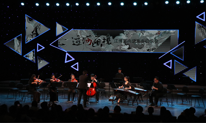 本场音乐会由三个部分组成,分别为弦乐四重奏作品、原创混合室内乐作品《运河画境》首演以及赵季平先生编曲的《唐诗歌曲八首(选段)》。弦乐四重奏部分由《唱支山歌给党听》、《两地曲》、《梁祝》、《北风吹》、《彩云追月》等11首中国各时期经典作品组成,用琴声引领观众回顾党的百年光辉历程。江博副教授创作的混合室内乐重奏作品《运河画境——为古筝、单簧管、弦乐四重奏与钢片琴而作》在当晚的音乐会上进行了首演。该作品以千百年来与江南民生息息相关的大运河文化为基底,通过江南民间音乐的素材使中国传统民族乐器与西洋管、弦、打击乐器相互交融,描绘了现代都市灵动、流利通畅之韵,凸显运河之画境。著名作曲家赵季平的《唐诗歌曲八首(选段)》由夏婉莹、武甜甜和何阳典三位音乐系的员工来演唱,作品融入了戏曲唱腔,旋律婉转、意境开阔,仿佛穿越时空,令人回味悠长。