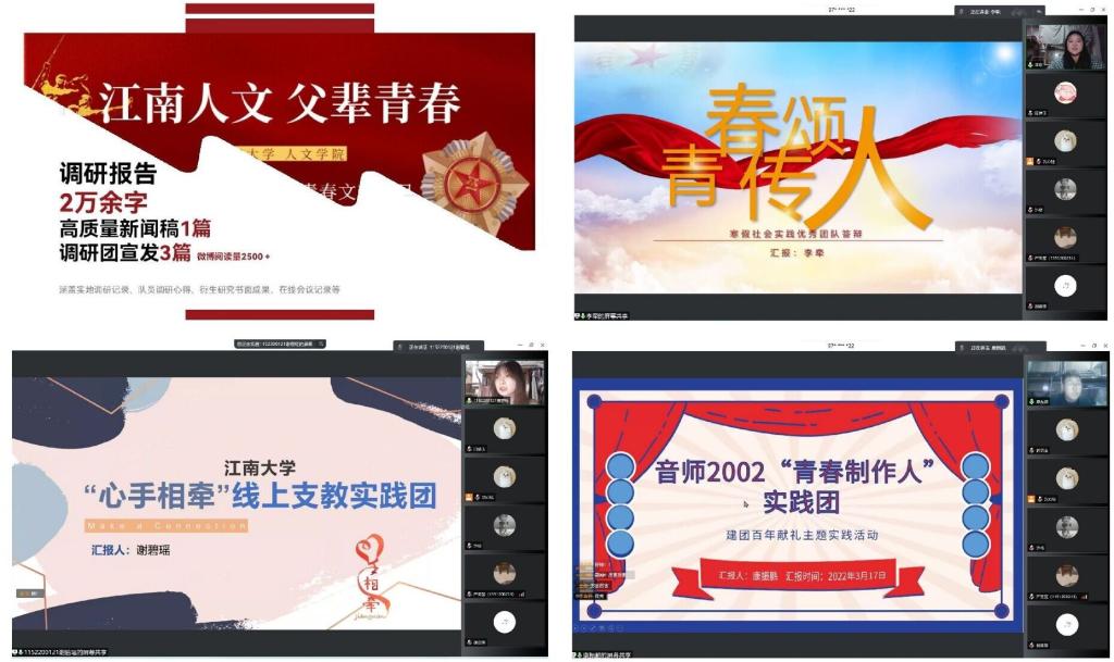 经筛选,此次答辩会共有11支团队、7个团支部和12位同学进入到最终的答辩环节。他们从实践选题、实践过程、实践效果、实践意义等方面介绍了各自团队的实践项目与完成情况。其中,“青春传颂人”团队分享了他们组织动员20余名团员青年参与共读《习近平与老员工朋友们》,同写读后感的实践过程,该项实践成果已陆续在公司公众号上发布。“缓病之计”社会实践团是舞蹈编导2020级同学立足于当代老年人病痛,让舞蹈走进社区伴健康晚年生活做的一次全新的尝试。“心手相牵”实践团这次则通过网络的方式开展了为期7天的“云支教”,为孩子们带去了寒假的问候,同时辅导完成寒假作业,帮助他们完成课业。