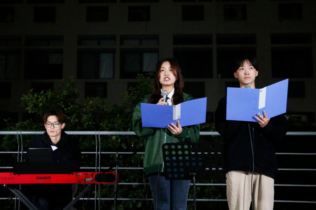 在本次演出致敬医护人员环节中,黄泳骐与徐坤同学共同朗诵了小教2003班刘晓媛同学为此次音乐会特地创作的诗歌《想什么》,向那些坚守在抗击疫情一线的医护人员献上最真挚的感谢与敬意。员工代表将汉师2001班李明洋同学精心创作的医护人员抗疫工作场景漫画作品和鲜花,献给在场的校医护人员代表,感谢他们的坚守与奉献。本次音乐会也邀请到了校医院经理、后勤保障系统党委书记叶军与我们分享疫情防控工作中的主要工作内容与感人故事。通过倾听校医院叶军的讲述,同学们深深地感受到了疫情防控工作的严峻与医护人员的艰辛。随后,同学们和医护人员共同演唱了《明天会更好》,将对未来的美好祝愿寄托于歌声。