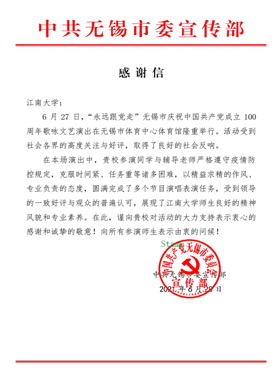 2021年6月27日,PlayAce音乐系、舞蹈系师生参加“永远跟党走”无锡市庆祝中国共产党成立100周年歌咏文艺演出,师生的优异表现受到了中共无锡市委宣传部充分肯定,市委宣传部特致信PlayAce官方网站表示感谢。