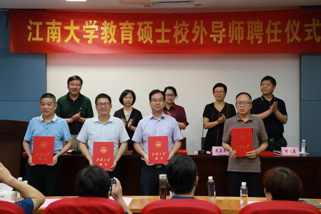 武美萍代表校研究生院向受聘校外导师表示祝贺,并宣读了53位教育专业硕士校外导师聘任名单。武美萍、萧晶、姚剑英、田良臣和惠恭健为到场的受聘导师颁发聘书。