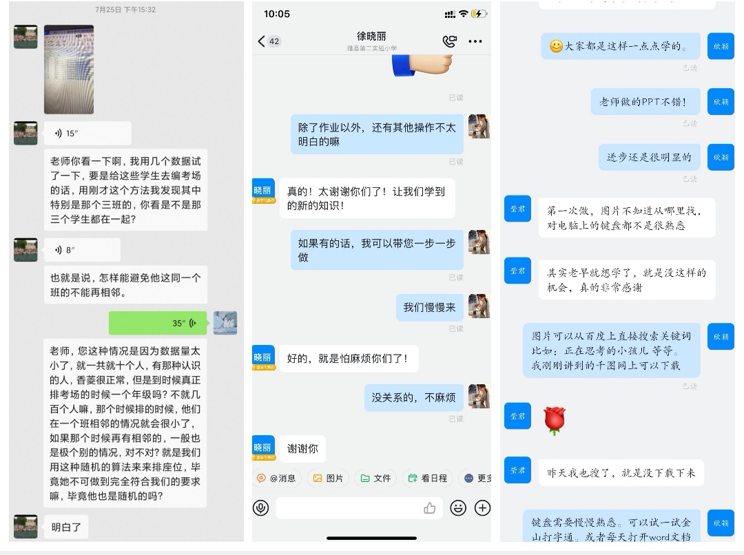 “老师您好,为了更好地跟进此次线上教学,提升教学质量和教学效率,我们采取小班对接辅导制,一名教学成员对接三名老师进行课后答疑,您遇到任何的问题均可直接与我联系!”这次线上支教是实践团成员第一次真正走上“讲台”进行“真刀真枪”的授课,也是第一次被老师喊“老师”。压力与责任并举,因此我们期望和授课对象之间达成良性的双向反馈,便于我们及时调整教学进度、完善教学设计。上课时,除授课教师外的其他实践团成员均会在线听讲,以第三视角在实践群里实时反馈授课问题以便授课教师进行调整。课后,实践团成员通过发放问卷及时了解老师的课程内容掌握情况及上课感受,基于问卷结果开展日常语音会议进行反思总结。同时,实践团成员会对老师提交的作业进行评价与反馈,供老师进行查漏补缺,以此达成教与学的双向反馈,努力实现高效率的教学。