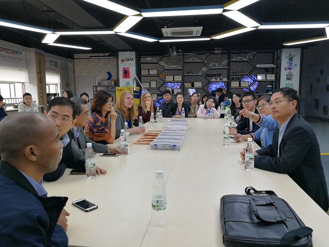 10月25日上午,在公司党委书记沈贵鹏教授、副经理田良臣教授的陪同下,弗吉尼亚联邦大学学术代表团与参会代表一行60余人分成两组,分别参观访问了PlayAce教育实习实践基地的代表性公司——“无锡市江南中学”和“无锡市第一中学”。无锡市江南中学吴书记和无锡市第一中学陈曦董事长和无锡市江南中学吴卫红书记对此次国际会议代表团一行访问公司表示欢迎。参观访问团现场观摩了两所重点中学的特色课程。