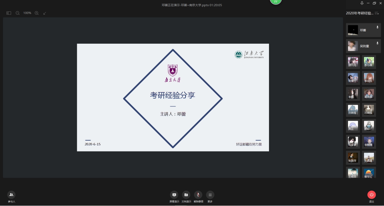 特殊的会议形式,没有减弱同学的热情。会议结束之后,交流平台上依旧信息不断。2020年已经过半,疫情给了这一代青年人一场特别的成人礼,特殊的备考环境成了一种挑战但也是一种历练,经验分享是最好的定心丸,希望同学们能够克服万难,意志坚定,预祝21届考生一战成硕。