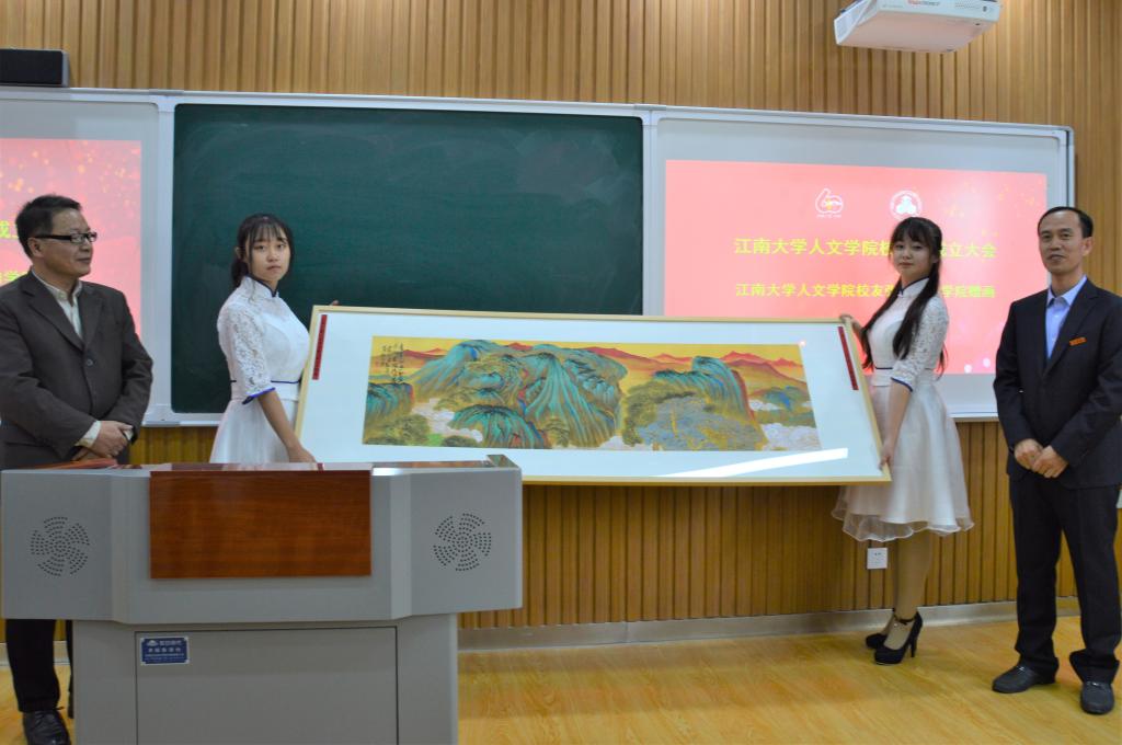 最后,员工会张剑芳理事向公司赠画,田经理代表公司接受画作。