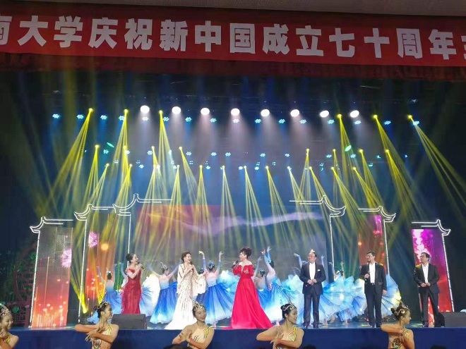 晚会开始之前,公司党委书记朱庆葆教授上台致辞,表达全校师生对祖国母亲最诚挚的热爱,同时希望全校上下继续求真务实、脚踏实地,推进世界知名、中国一流、江南风格的研究型大学的建设。主题晚会在上篇“致敬70年”中拉开帷幕。整个晚会以70年峥嵘岁月的回顾为时间线索,以组歌、笛子重奏、配乐诗朗诵、群舞、阿卡贝拉、二胡重奏、踢踏舞、民族健身操等风格多元的形式表达对祖国无以言表的赞美之情。整场晚会即清透雅致又厚重浓郁,演员们的表演恰到好处,赢得台下领导和师生的高度认可和阵阵掌声。尾声《祖国万岁》之后,在场的2000余名师生起立齐唱《我和我的祖国》,将晚会推向高潮。歌曲的情绪深深地感动着在场的每一个人,乐曲结束后,很多师生仍久久不肯离去......