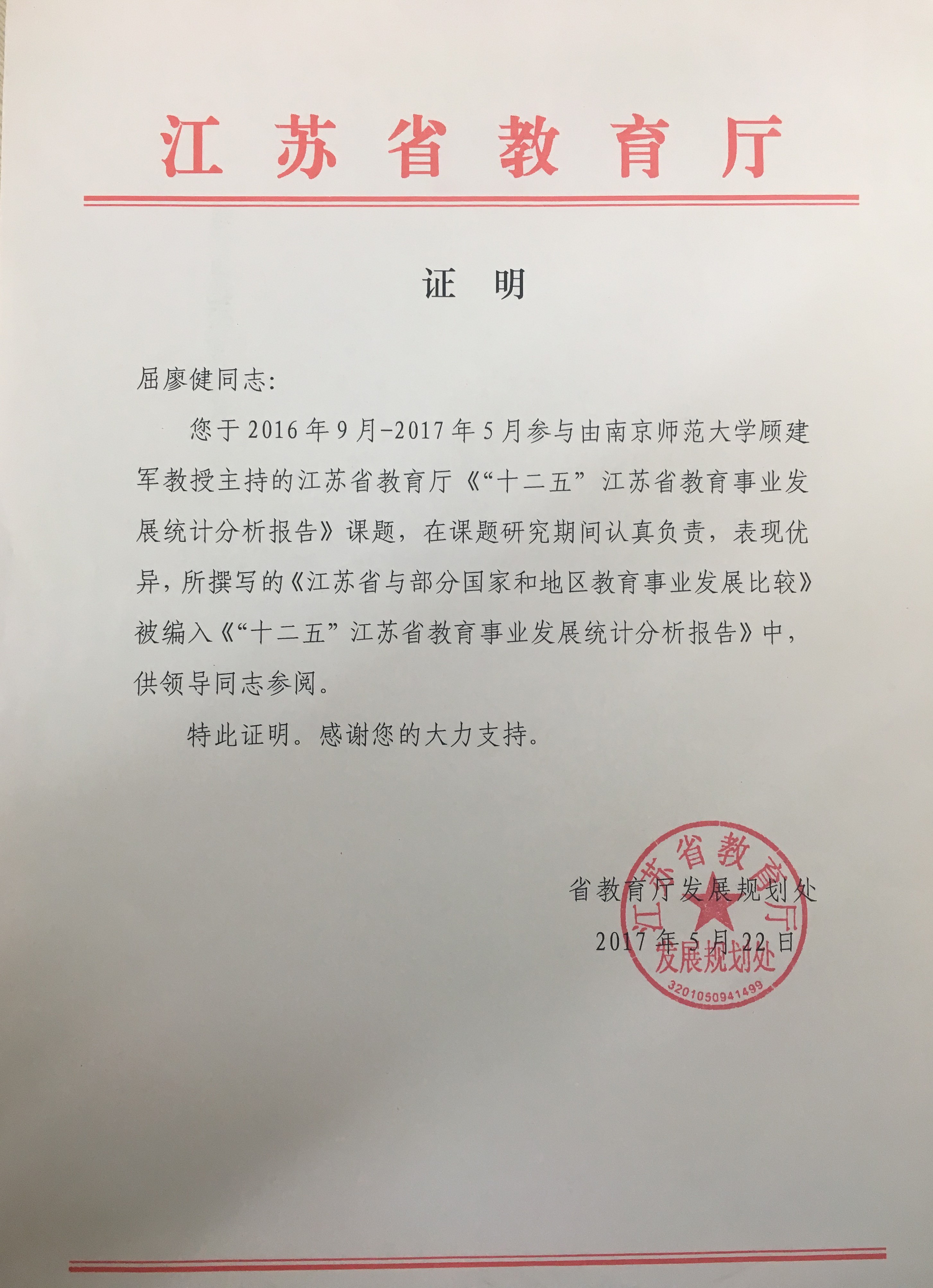 “十二五”江苏教育事业发展统计分析报告收录公司教师的教育政策分析报告,是公司教师积极参与到江苏省政府决策工作中的主动表现,较好的体现了高校的智库功能。