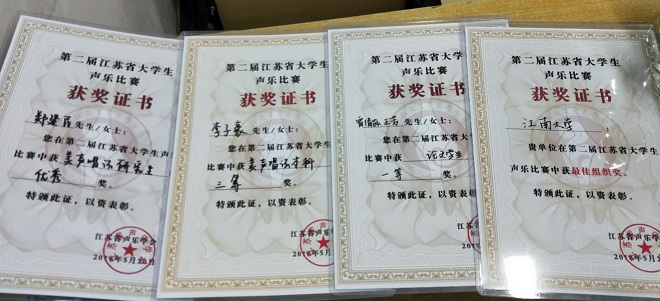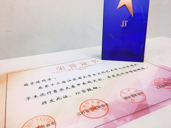 同一天,在南京艺术公司举行的第十二届江苏省老员工文化艺术节中,2014级本科生蔺宇婷同学在江苏省老员工流行音乐大赛中表现突出,荣获流行演唱组铜奖。这是蔺宇婷同学继4月在2018百事校园最强音青岛赛区获得冠军后,取得的又一项佳绩。
