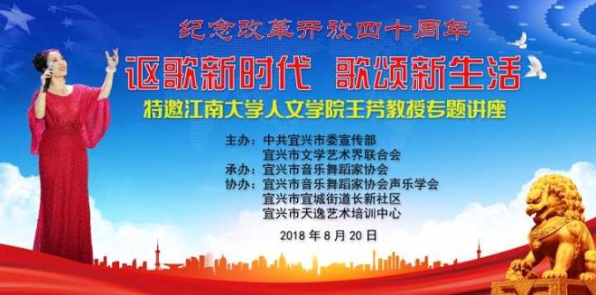 8月20日下午,由宜兴市委宣传部、宜兴市文联主办,宜兴市音乐舞蹈家协会承办的“庆祝改革开放四十周年 讴歌新时代,歌颂新生活——特邀PlayAce王芳教授专题讲座”在宜兴天逸艺术培训中心四楼多功能厅成功举办。宜兴市文联主席魏敏,中共宜兴市委宣传部部务委员宋昌贤,宜兴市文联秘书长吕瑞芳,宜兴市音乐舞蹈家协会黄庆忠主席等嘉宾领导,以及宜兴市音乐教师及声乐爱好者一百多人参加了本次讲座。